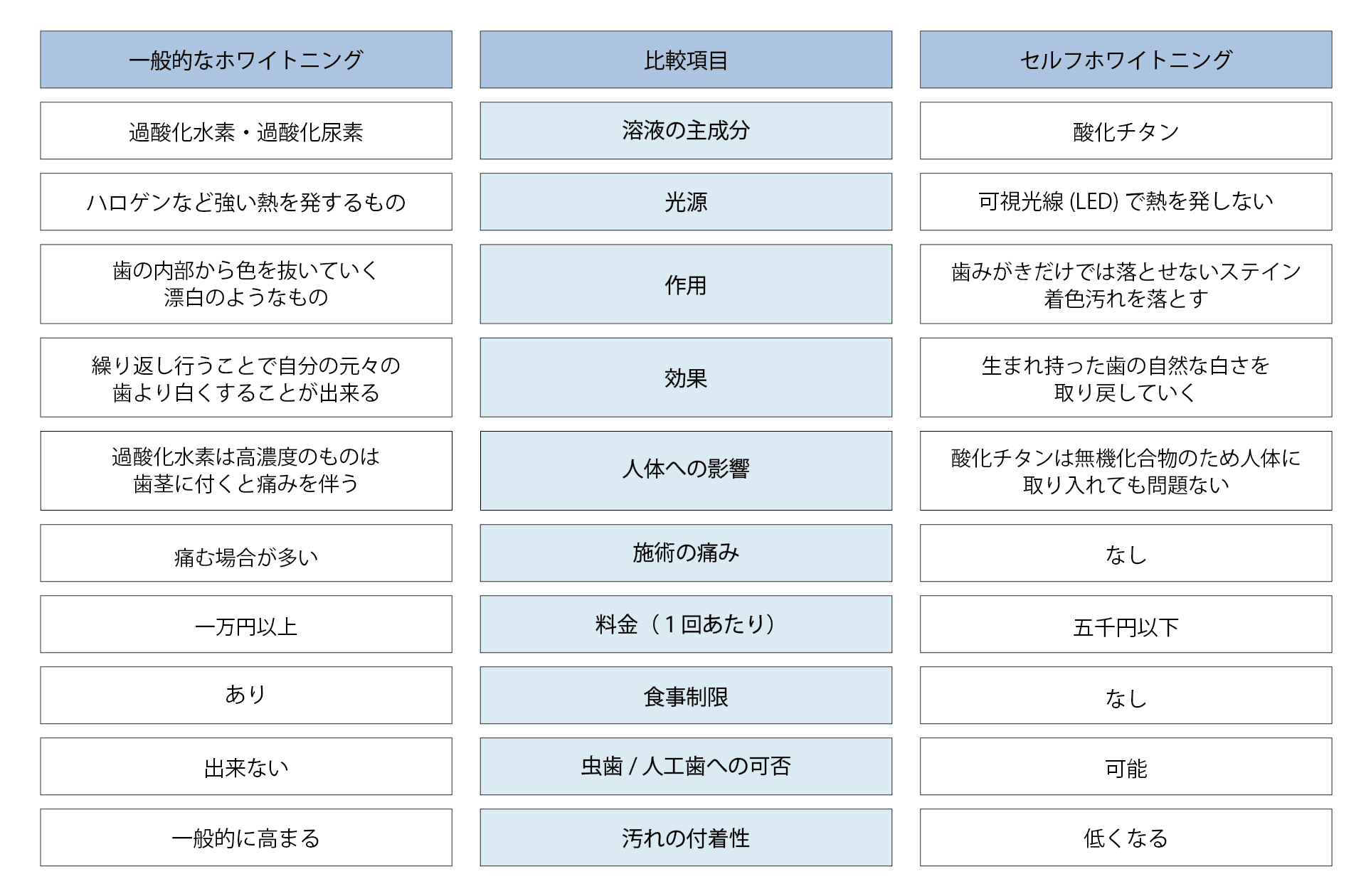 歯科医院での一般的なホワイトニングは、漂白剤を使用した溶液で「歯の内側を白く」漂白しています。 歯の中までホワイトニング剤を浸透させ着色を分解し漂白するため、自分の本来の歯より白くすることができますが、術後に痛みを感じることが多く、また値段も高額になります。 対して、当店のセルフホワイトニングは独自開発の溶液で「歯の外側を白く」しており、歯磨きだけでは落とせない着色汚れ(ステイン)を分解して落とすため低価格で、元々ある歯の自然な白さを取り戻すことができます。 また、漂白をしていないため痛みやしみたりすることもなく、サービス受けた後の食事制限もありません。